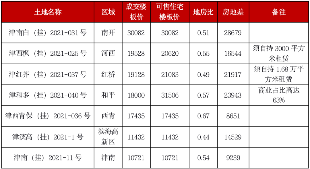 舉個例子,本輪成交樓板價超過1萬元/平方米的高價地中,7宗地,僅有1幅地的地房比超過0.6,其余地塊的地房比都在0.4~0.6之間。包括位于南開中心區域的南開區靈隱南里地塊,該地塊創下本輪成交名義地價最高,成交樓板價達3萬元/平方米,但其周邊多為高端改善住宅項目,平均售價接近6萬元/平方米,因此該項目的地房比僅有0.51,房地差也高達2.8萬元/平方米,利潤空間十分充足。