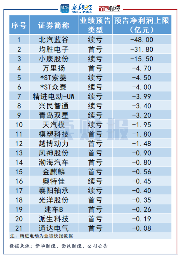 此外,萬里揚、*ST索菱虧損上限在4億元以上,精進電動、興民智通、青島雙星虧損上限均達3億元以上。