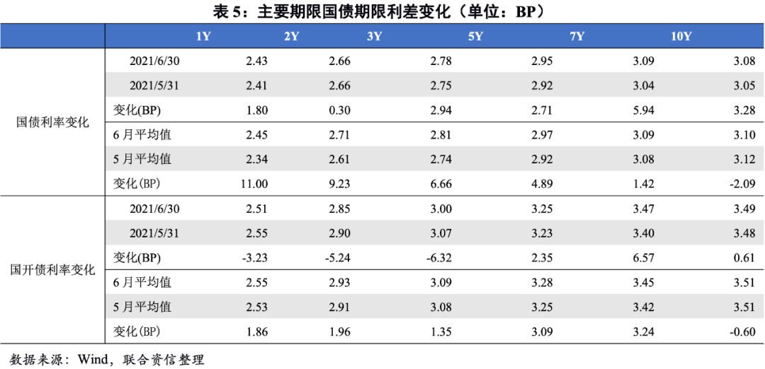 期限利差大多收窄。從期限利差來看,國債10Y-1Y及3Y-1Y期限利差波動較大,都呈現上半月期限利差收窄、下半月期限利差走闊的軌跡。國開債除10Y-1Y期限利差波動較小外,其余期限利差均經歷了較大的波動。整體看,6月主要期限國債和國開債期限利差均值大多較5月收窄,收益曲線趨向平坦化。