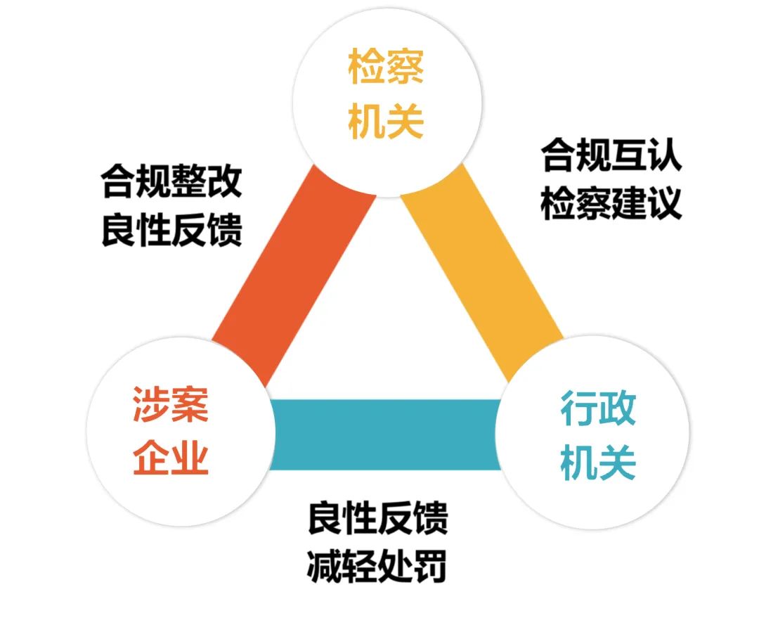 企業合規機制往往會橫跨多個法律程序,不同法律程序之間的銜接問題是合規機制在實踐過程中經常遇到的難題,本案中X公司的違法行為同時涉及到了行政程序和司法程序,如何將兩個程序銜接在一起則成為本案的重點。如下圖所示深圳市檢察院通過實踐,將涉案企業合規整改作為橋梁,在三方之間形成了良性的互動,取得了三方共贏的局面,為刑事司法與行政管理程序的有效銜接起到了很好的示范作用:
