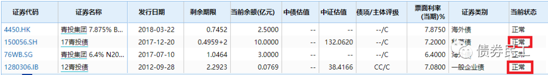 青海省投目前存續(xù)的12青投債(企業(yè)債)和17青投債(公司債)兩只債券付息正常,但是按照清算組的債務(wù)申報(bào)和處置程序,依靠自身實(shí)現(xiàn)債券兌付的可能性基本為零。目前青海省投的主體信用級(jí)別已經(jīng)下調(diào)至C。