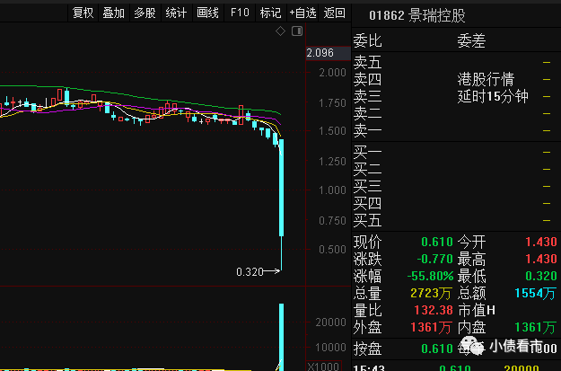 5月30日,景瑞控股(01862.HK)開盤后一路下跌,臨近中午開始跳水,股價最低下探至0.32港元,跌幅75%,創出歷史新低;午后其股價雖震蕩回升,但跌幅仍超50%。