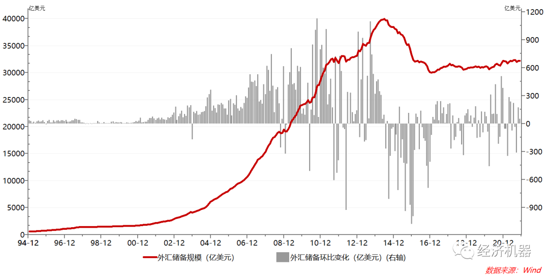貿(mào)易高順差狀態(tài)持續(xù),但并未帶來外匯儲(chǔ)備增長。由于進(jìn)口的超預(yù)期增長,11月我國貿(mào)易順差達(dá)717.2億美元,較上月高位回落,同比減少3.4%,低于預(yù)期的854億美元。但由于今年以來,出口持續(xù)強(qiáng)勁,我國貿(mào)易順差持續(xù)暴增,預(yù)計(jì)全年將達(dá)6400億美元。但高額貿(mào)易順差并未轉(zhuǎn)化為外匯儲(chǔ)備。11月份我國外匯儲(chǔ)備規(guī)模為3.22萬億美元,僅較去年底增加580億美元,幾乎沒有變化(圖3)。