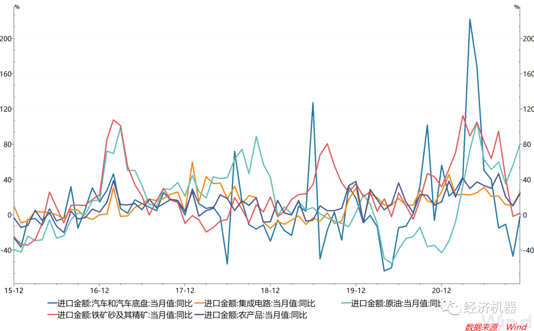 此外,隨著能源短缺的緩解,生產(chǎn)恢復(fù)也帶動(dòng)了進(jìn)口需求。上中下游(如汽車、集成電路、原油、農(nóng)產(chǎn)品等)進(jìn)口增速均有不同程度的提升(圖2)。