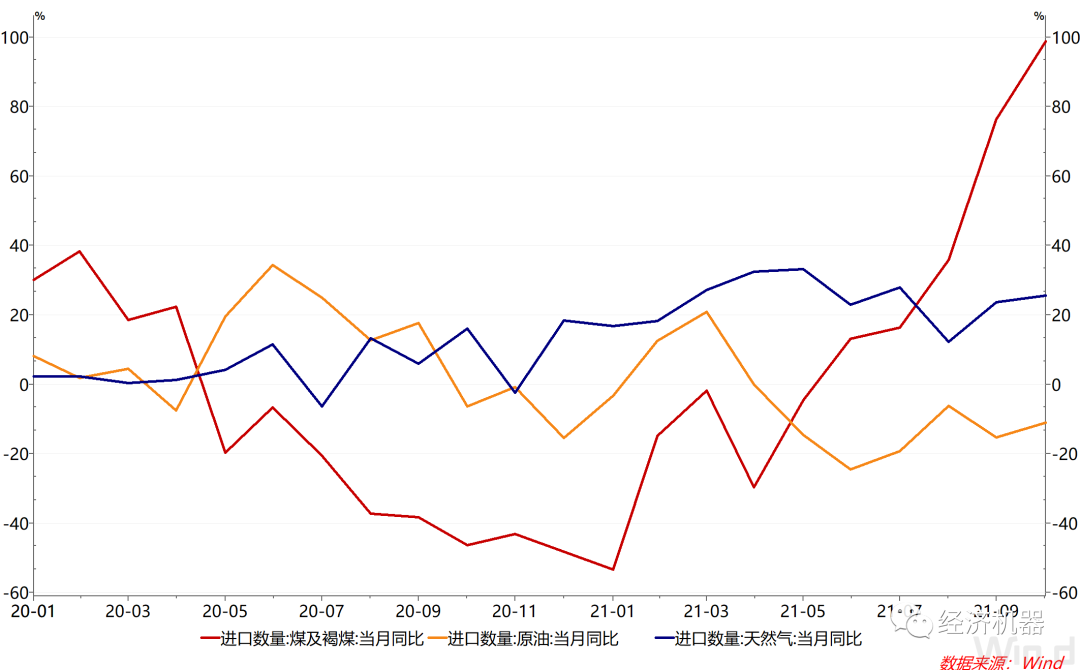 進(jìn)口表現(xiàn)大幅超預(yù)期。11月,我國進(jìn)口2538.1億美元,同比增長31.7%,較上月提升11.1個(gè)百分點(diǎn),遠(yuǎn)高于預(yù)期的18.2%。這或許得益于我國能源保供政策的強(qiáng)力推進(jìn)。10月份以來,我國加快對(duì)煤炭等大宗商品進(jìn)口的清關(guān)速度,以緩解國內(nèi)能源短缺。11月,我國進(jìn)口煤約3500萬噸,環(huán)比增長30.11%,同比增長98.7%(圖1)。能源保供下,部分大宗商品進(jìn)口暴增,或許是進(jìn)口超預(yù)期的重要推動(dòng)因素。