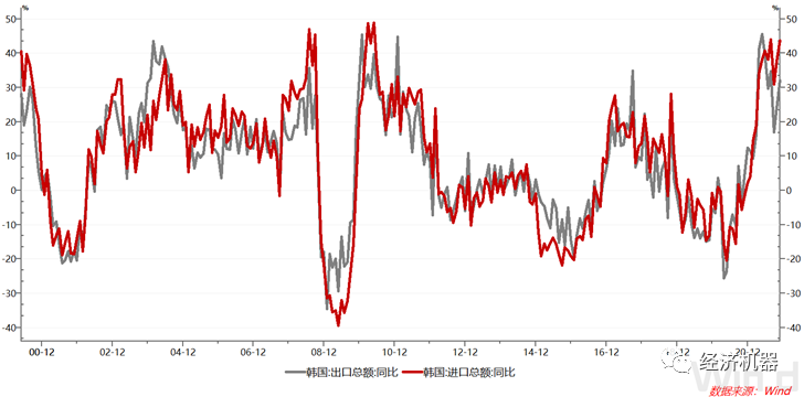 作為全球經(jīng)濟(jì)金絲雀的韓國,其進(jìn)出口增速是全球貿(mào)易的晴雨表,近期也持續(xù)回升。11月韓國出口同比增長32.1%,較上月加快8個(gè)百分點(diǎn),進(jìn)口同比增長43.6%,較上月加快5.9個(gè)百分點(diǎn),均連續(xù)兩月回升,進(jìn)口同比增速更是接近8月份的高點(diǎn),這也表明全球經(jīng)濟(jì)短期增長無憂(圖7)。