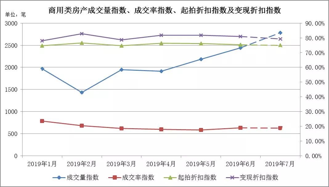 (一) 商用類房產(chǎn):成交量持續(xù)上升,成交率小幅增長,起拍折扣指數(shù)、變現(xiàn)折扣指數(shù)保持平穩(wěn)