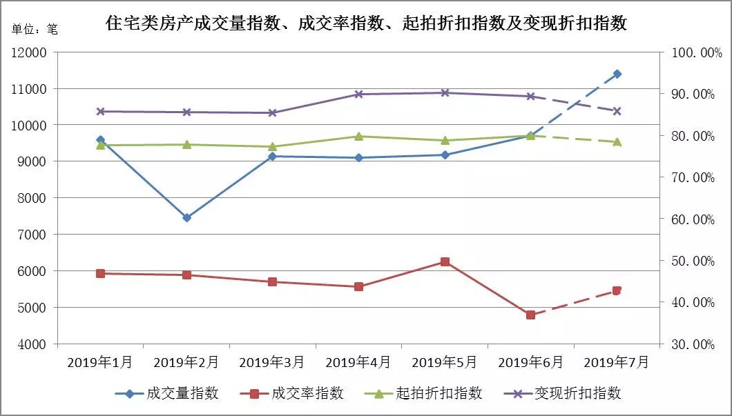 - 七月預(yù)測:成交量在1601至1903筆左右,成交率指數(shù)區(qū)間[66.55%,69.03%],起拍折扣指數(shù)區(qū)間[80.21%,81.40%],變現(xiàn)折扣指數(shù)區(qū)間[105.97%,107.79%]。