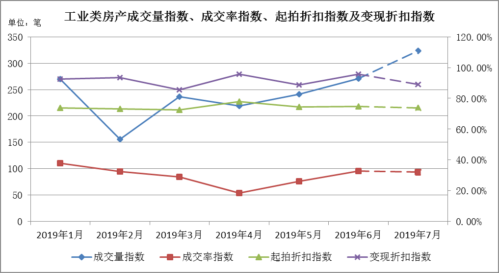 - 趨勢分析:本月工業(yè)類房產(chǎn)成交量270筆,新增29筆,環(huán)比增長11.97%,有持續(xù)增長趨勢;成交率為32.91%,環(huán)比增長26.53%,成交率在2019年1月-4月逐月遞減,后有所回升,呈上升趨勢;起拍折扣指數(shù)為74.63%,基本與上月齊平;變現(xiàn)折扣指數(shù)為95.71%,環(huán)比增長7.97%,從1月以來工業(yè)類房產(chǎn)的變現(xiàn)折扣指數(shù)在85%~95%范圍內(nèi)上下波動頻繁。