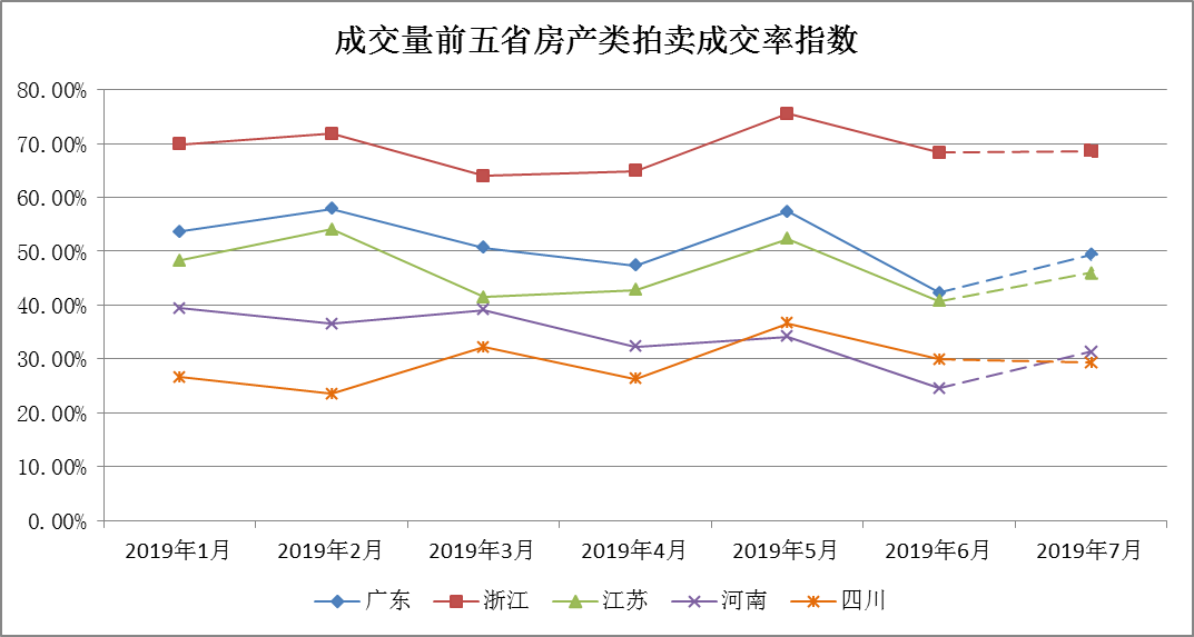 2019年1月至今,前五省的成交率趨勢較為一致,本月五省的成交率都有所下降,特別是廣東省,下降了近15個百分點。從今年整體趨勢來看,成交率從大到小排列依次為浙江、廣東、江蘇、河南、四川,江浙地區(qū)、珠三角地區(qū)經(jīng)濟(jì)發(fā)展水平較高,拍賣市場交易更為開放,拍賣成交的可能性也更大。