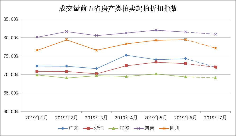 2019年各省房產(chǎn)拍賣起拍折扣指數(shù)的變化趨勢基本趨同,總體而言起拍折扣指數(shù)范圍在70%~80%左右;河南、四川省的起拍折扣指數(shù)較高,廣東省的起拍折扣指數(shù)波動較大,未來五省的起拍折扣指數(shù)均有下降趨勢。