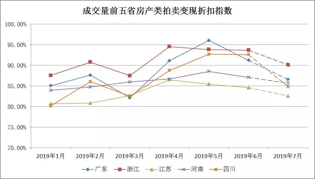 廣東、浙江、江蘇穩(wěn)居房產(chǎn)類拍賣品成交量前三,本月四川省成交量進(jìn)入前五;前五省的成交率指數(shù)與變現(xiàn)折扣指數(shù)均明顯下降,說明前五省的拍賣房產(chǎn)流動性與市場投資認(rèn)可度都在降低。