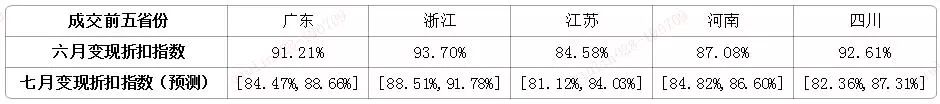 - 七月預(yù)測:成交量在2562至3002筆左右,成交率指數(shù)區(qū)間[17.83%,19.54%],月起拍折扣指數(shù)區(qū)間[74.58%,75.31%],變現(xiàn)折扣指數(shù)區(qū)間[77.89%,80.63%]。