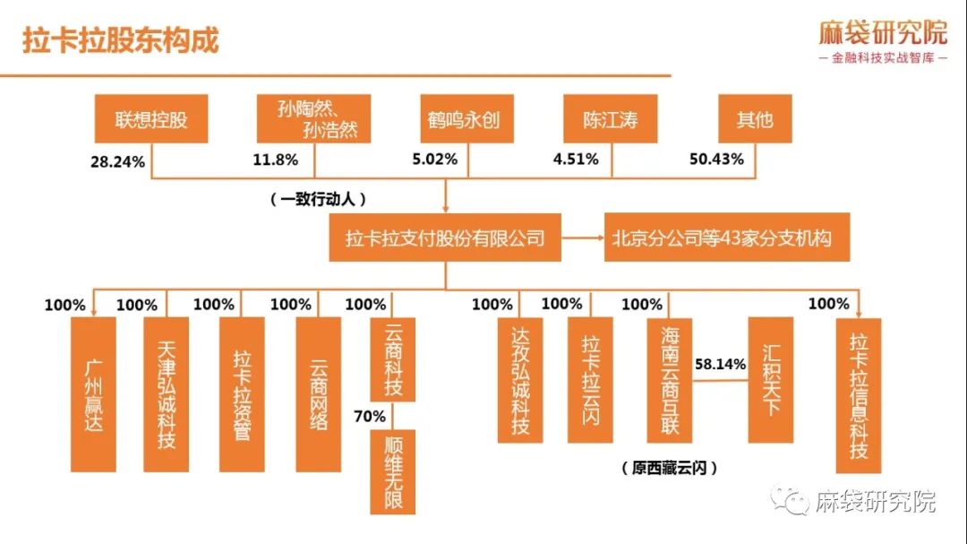聯想控股為拉卡拉的第一大股東,持股比例28.24%,公司無實際控制人。法定代表人為孫陶然,與一致行動人孫浩然共同持股11.8%。
