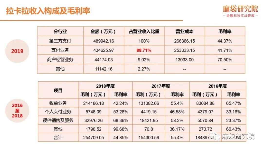 支付起家的拉卡拉,主營業務是為實體小微企業提供收單服務及為個人用戶提供支付服務,屬于第三方支付服務,核心盈利模式是通過向商戶提供收單業務收取手續費及通過為個人提供支付服務收取手續費。