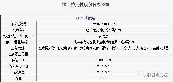 2011年5月,拉卡拉成為央行第一批頒發的27家《支付業務許可證》單位之一,獲全國性收單、網絡支付、電視支付、預付費卡受理等業務許可。