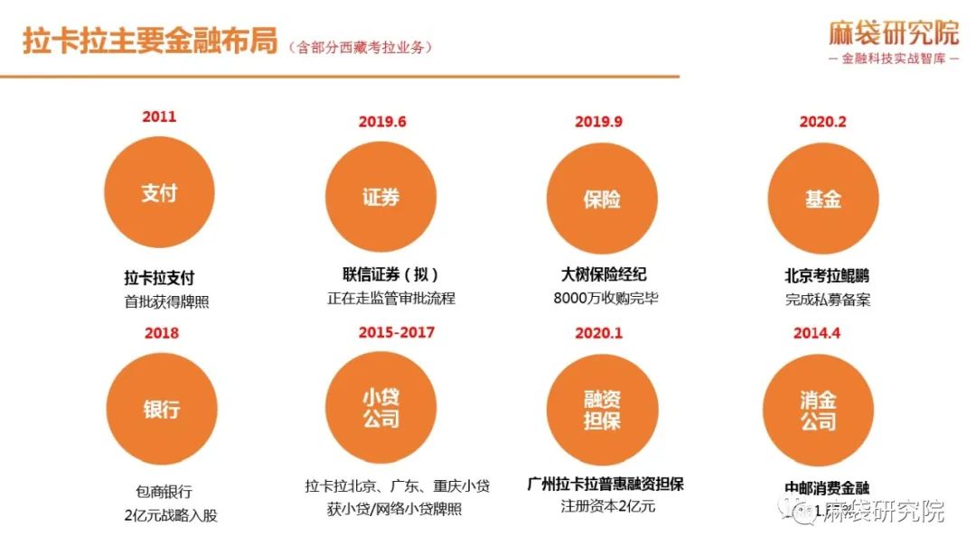 小貸:北京拉卡拉小貸成立于2015年6月,廣州拉卡拉小貸成立于2016年4月,重慶拉卡拉小貸成立于2017年5月。