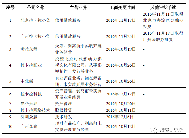 相比前赴后繼的跨界弄潮兒,自帶金融家底的拉卡拉在上市之際卻顯得十分謹慎。互聯網金融業務曾為一些上市公司帶來高光無限的時刻,卻又在幾年后使得企業深陷泥潭,可謂是“成也蕭何、敗也蕭何”,這樣的例子有熊貓金控、奧馬電器等。在謀劃上市前的2016年,拉卡拉就著手準備了剝離措施。招股說明書顯示,小貸、眾籌和影業等10家子公司被拉卡拉歸為“增值金融業務”,由于發展帶來的不確定性,公司決定剝離,交易價款為14.44億元。2016年10月至12月,下述10家公司已陸續完成變更和相應的審批手續: