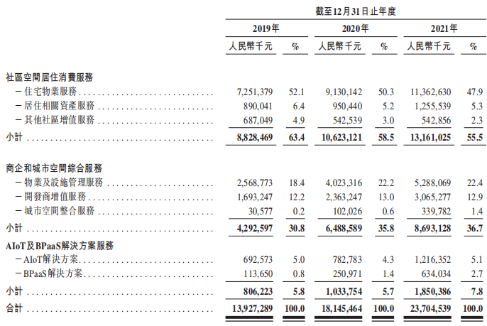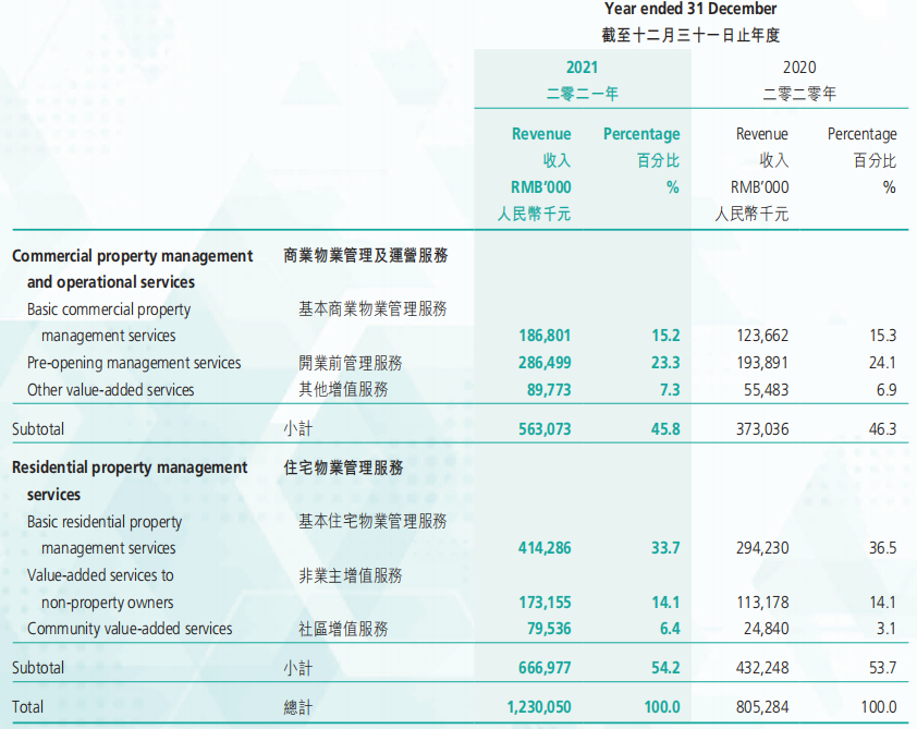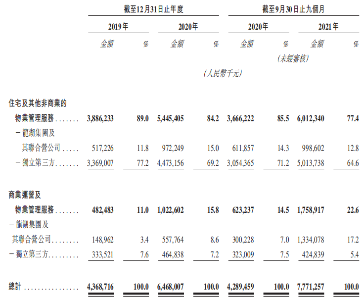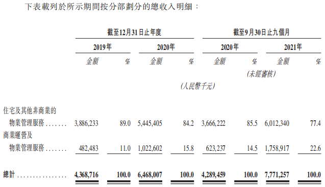 其中,住宅及其他非商業(yè)的物業(yè)管理服務(wù)占總收入的77.4%為60.12億元,商業(yè)運營及物業(yè)管理服務(wù)占總收入的22.6%為17.58億元。