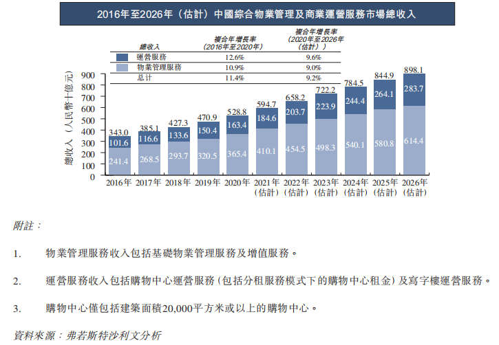 根據(jù)廣受地產(chǎn)企業(yè)引用的弗若斯特沙利文的分析數(shù)據(jù),未來五年物業(yè)管理尤其是商業(yè)運營管理服務(wù)市場仍處于快速增長期。