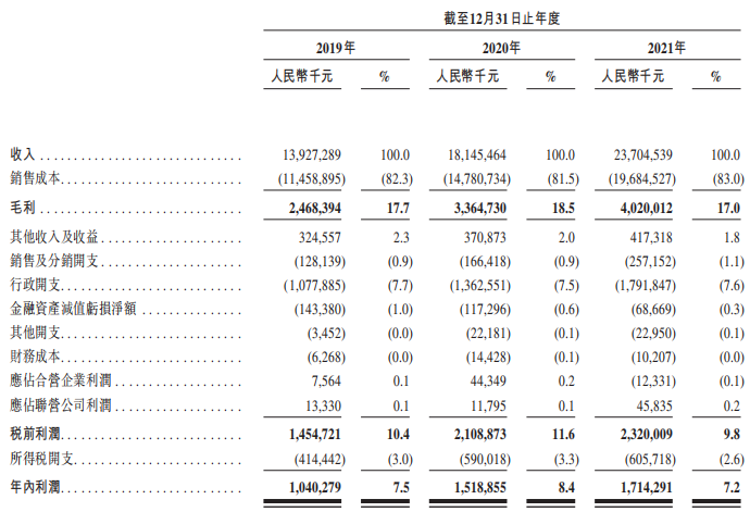根據(jù)招股說明書顯示,截止2021年9月30日,收入由2020年9月30日的42.89億元增長至2021年9月30日的77.71億元;毛利也增長至21.454億元;毛利率為27.6%。