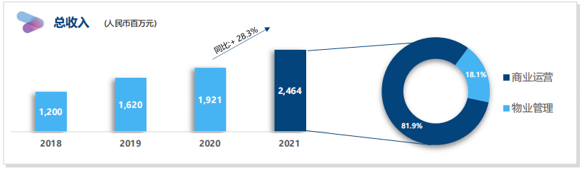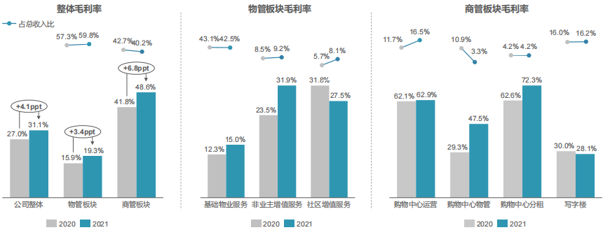 商管業(yè)務(wù)方面,公司商業(yè)運營業(yè)務(wù)仍占據(jù)核心地位,營收貢獻(xiàn)比達(dá)81.9%,2021年實現(xiàn)收入20.17億元,同比增加29.1%。商業(yè)運營服務(wù)業(yè)務(wù)實現(xiàn)毛利約7.11億元。