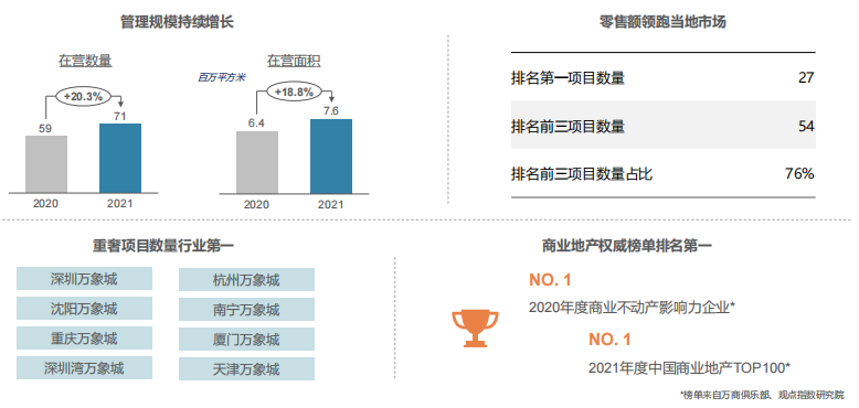 按截止至2020年年底的總在管建筑面積計算,珠海萬達(dá)商管是中國最大的商業(yè)運營服務(wù)提供商,市場份額為8.3%。同時也是行業(yè)中科技驅(qū)動的商業(yè)管理和數(shù)字化運營的先驅(qū),主要專注于商業(yè)廣場。