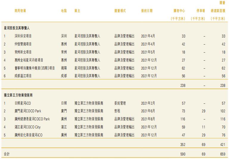 報告期間內(nèi),集團(tuán)相繼與上海建工集團(tuán)、廈門特房集團(tuán)、廣州立白集團(tuán)等建立合作,成功簽約日照星河iCO、廈門星河COCO Park、廣州健康港星河COCO Park、廣州從化海音星河iCO、湛江星河COCO City,共計5個第三方項目: