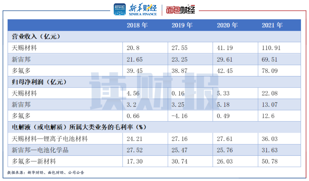 在鋰電電解液板塊中,行業領先公司多氟多、天賜材料和新宙邦已發布2021年年報。受益于下游鋰電池市場需求大幅增長,三家原材料公司的業績均顯著增長。