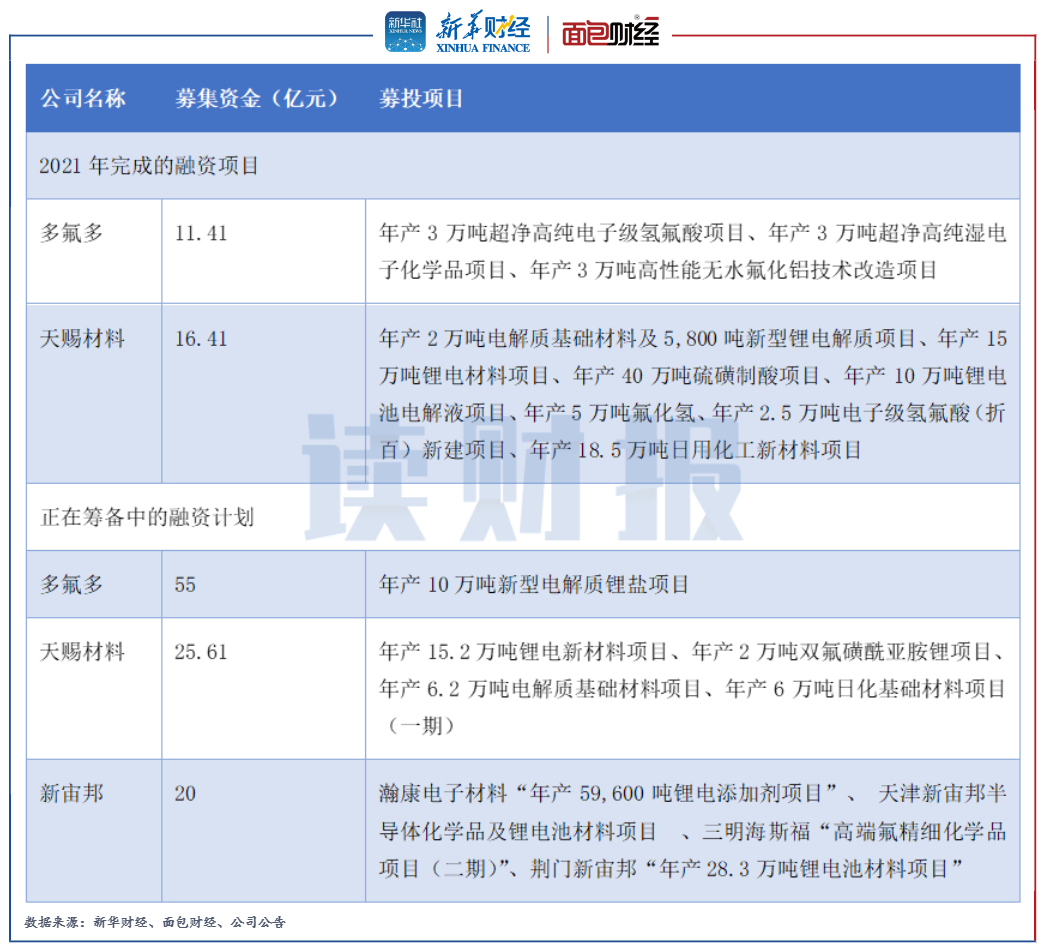 2021年,天賜材料和多氟多完成定增分別募資約16.41億元和11.41億元,且三家公司均拋出計劃擬通過兼并收購或引入新投資者的形式擴大經營和資本規模。