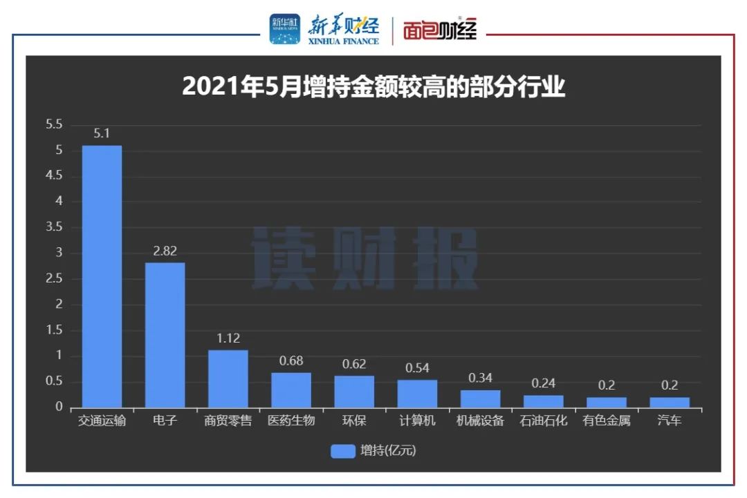5月份,各行業(yè)中,石油石化行業(yè)增持金額均居首位,交通運輸行業(yè)增持金額最多。
