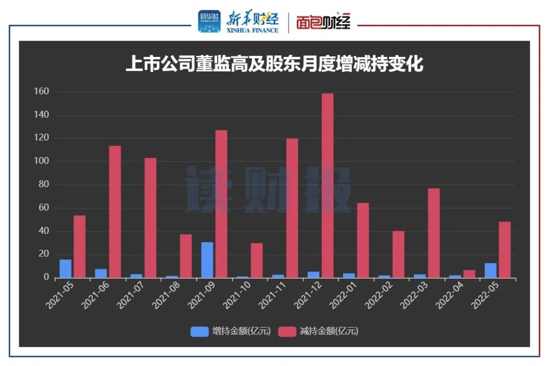 2022年5月,滬深兩市上市公司董監(jiān)高及其關(guān)聯(lián)人減持金額合計約48.27億元,涉及126家公司;增持金額合計約12.6億元