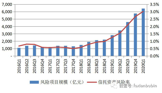 二是信托行業(yè)風(fēng)險資產(chǎn)規(guī)模及不良率持續(xù)攀升。在金融去杠桿、強監(jiān)管的宏觀政策背景下,銀行表外資金加速回表,同時平臺公司舉債受限,企業(yè)現(xiàn)金流相對緊張,部分信托公司展業(yè)較為激進,前期高速發(fā)展積聚的風(fēng)險開始加速釋放,導(dǎo)致信托計劃逾期甚至違約事件增多。早在2020年一季度,信托業(yè)協(xié)會在2020年6月發(fā)布的《2020年1季度中國信托業(yè)發(fā)展評析》中表示,隨著風(fēng)險資產(chǎn)規(guī)模的增加以及行業(yè)整體信托資產(chǎn)規(guī)模的壓降,信托資產(chǎn)風(fēng)險率也在持續(xù)提升。2020年1季度末,信托業(yè)資產(chǎn)風(fēng)險率為3.02%,較2019年末提升0.35%;但環(huán)比增幅較2019年末的0.57%下降了0.22個百分點。從風(fēng)險項目數(shù)量和風(fēng)險資產(chǎn)規(guī)模的環(huán)比變動來看,2020年1季度末,信托業(yè)風(fēng)險項目個數(shù)為1626個,環(huán)比增加79個,增幅為5.11%。2020年1季度末,信托行業(yè)風(fēng)險資產(chǎn)規(guī)模為6431.03億元,環(huán)比增加660.56億元,增幅11.45%。從同比來看,2020年1季度末信托項目數(shù)量和風(fēng)險資產(chǎn)規(guī)模同比增幅分別為61.63%和127.20%。2020年1季度,在新冠疫情以及監(jiān)管部門加大風(fēng)險排查力度的影響下,信托行業(yè)風(fēng)險仍在持續(xù)暴露。但預(yù)計信托風(fēng)險資產(chǎn)規(guī)模變化2020年將趨平穩(wěn),行業(yè)風(fēng)險整體可控。