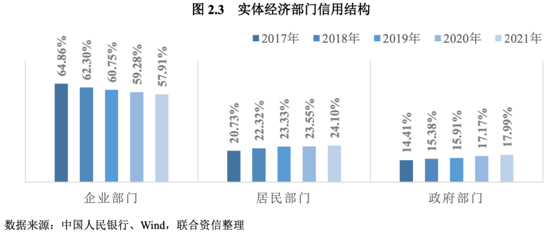 2021年信用結(jié)構(gòu)變動趨勢較往年一致,企業(yè)部門信用量占比進(jìn)一步走低。截至2021年末,我國企業(yè)部門、居民部門及政府部門信用量占比分別為57.91%、24.10%和17.99%,其中企業(yè)部門較2020年末下降1.37個百分點(diǎn),居民部門和政府部門分別增加0.55個百分點(diǎn)和0.82個百分點(diǎn)。近年來,隨著資管新規(guī)對企業(yè)非標(biāo)融資的持續(xù)壓降,居民房屋貸款及消費(fèi)貸款提升,以及政府債券在政府債務(wù)顯性化過程中的持續(xù)發(fā)力,我國企業(yè)部門信用量占比連年下降,政府部門及居民部門信用量占比持續(xù)提升,2021年我國實(shí)體部門信用結(jié)構(gòu)仍延此趨勢變動。