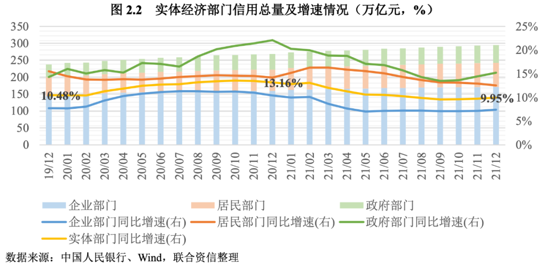 ?2021年,央行綜合運(yùn)用降準(zhǔn)、公開市場操作、中期借貸便利等工具,保持流動性合理充裕,貨幣供給靈活適度,企業(yè)綜合融資成本穩(wěn)中有降。隨著新冠肺炎疫情逐步恢復(fù)平穩(wěn)態(tài)勢,局部地區(qū)發(fā)生的本土聚集性疫情基本也能做到短時間內(nèi)控制,實(shí)體經(jīng)濟(jì)部門信用擴(kuò)張?jiān)鏊僦鸩节吘彛軛U率有所回落。各部門信用量仍延往年趨勢變動,即企業(yè)部門信用量占比連年下降,政府部門及居民部門信用量占比持續(xù)提升,從杠桿率看,企業(yè)部門杠桿降幅最大,居民部門杠桿保持相對平穩(wěn),政府部門杠桿水平呈現(xiàn)V型增長。