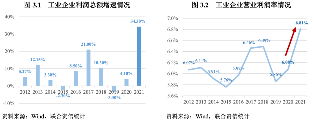 工業(yè)企業(yè)盈利水平周期性提升,企業(yè)抵御外部風(fēng)險能力增強(qiáng)。2021年隨著工業(yè)品價格飆升,我國工業(yè)企業(yè)經(jīng)營狀況較2020年疫情爆發(fā)階段回暖,工業(yè)企業(yè)整體盈利水平及盈利能力提升,有利于企業(yè)增加積蓄儲備,特別是上游工業(yè)企業(yè),為抵抗2022年可能面臨的供需矛盾提供了緩沖墊,提升了抵御短期信用風(fēng)險的能力。同時,經(jīng)過2015年“三去一降一補(bǔ)”的陣痛改革,企業(yè)財(cái)務(wù)彈性改善,應(yīng)對2022年可能面臨的經(jīng)濟(jì)波動及資產(chǎn)價格變化更具韌性。