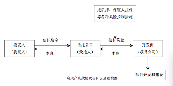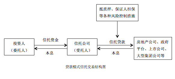 信托公司通過信托計劃向投資人募集資金并向房地產公司、政府平臺、上市公司、大型集團公司等發(fā)放貸款,融資方以其關聯(lián)資產進行抵質押、保證人擔保等各種風險措施保證債權安全,到期后由融資方還本付息。