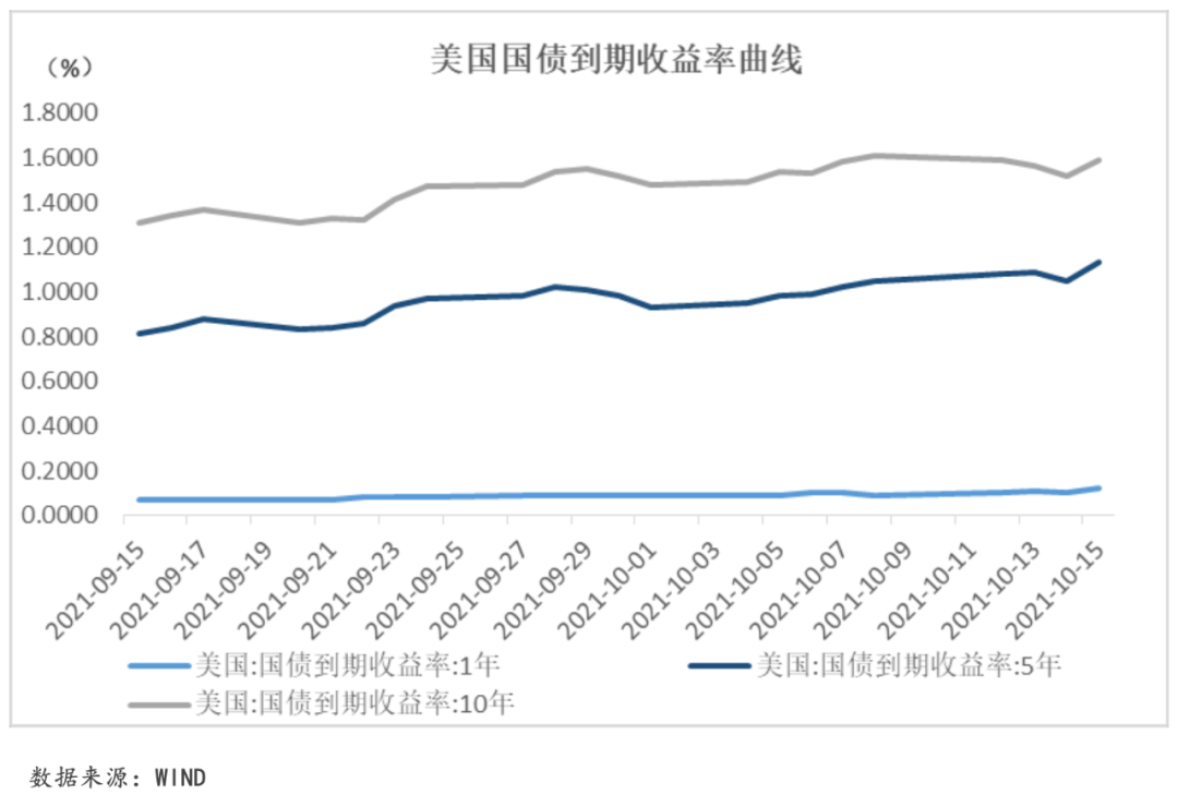 本周美聯(lián)儲(chǔ)鷹派立場對(duì)債券市場的影響仍在持續(xù),同時(shí)周五公布的9月零售數(shù)據(jù)明顯好于預(yù)期,加強(qiáng)了市場對(duì)于美聯(lián)儲(chǔ)提前加息的預(yù)期,各期美債收益率隨即大幅上升。從總體來看,1年期、5年期和10年期美國國債平均收益率分別較上周上漲1.35個(gè)、8.95個(gè)和1.50個(gè)BP至0.11%、1.09%和1.57%。