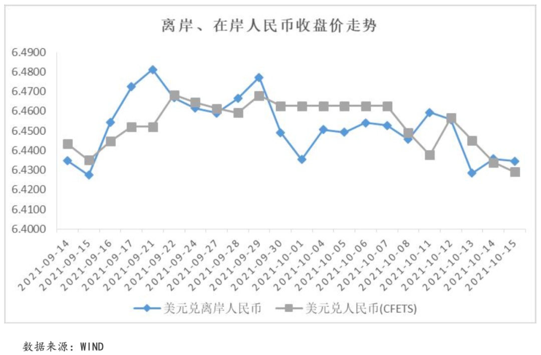 本周,在美元指數(shù)走弱的背景下,離、在岸人民幣匯率均小幅升值。截至周五,美元兌離岸人民幣匯率收于6.4345,周內(nèi)累計(jì)收跌0.16%;美元兌在岸人民幣匯率收于6.4291,周內(nèi)累計(jì)收跌0.20%。