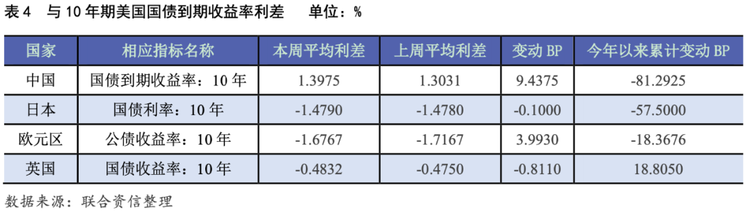 本周各期限中美國債平均收益率利差走勢不一,1年期中美國債平均收益率利差較上周收窄2.27個(gè)BP至2.23%;5年期和10年期中美國債平均收益率利差分別較上周走擴(kuò)2.47個(gè)和9.44個(gè)BP至1.72%和1.40%。本周1年期、5年期和10年期日美國債平均收益率利差分別較上周走擴(kuò)1.82個(gè)、8.11個(gè)和0.10個(gè)BP至-0.23%、-1.16%和-1.48%。本周1年期和10年期歐元區(qū)公債與相應(yīng)期限美債平均收益率利差分別較上周收窄0.02個(gè)和3.99個(gè)BP至-0.83%、-1.68%;5年期歐元區(qū)公債與相應(yīng)期限美債平均收益率利差較上周走擴(kuò)2.29個(gè)BP至-1.58%。本周5年期和10年英美國債平均收益率利差分別較上周收走擴(kuò)2.62個(gè)和0.81個(gè)BP至-0.34%和-0.48%。