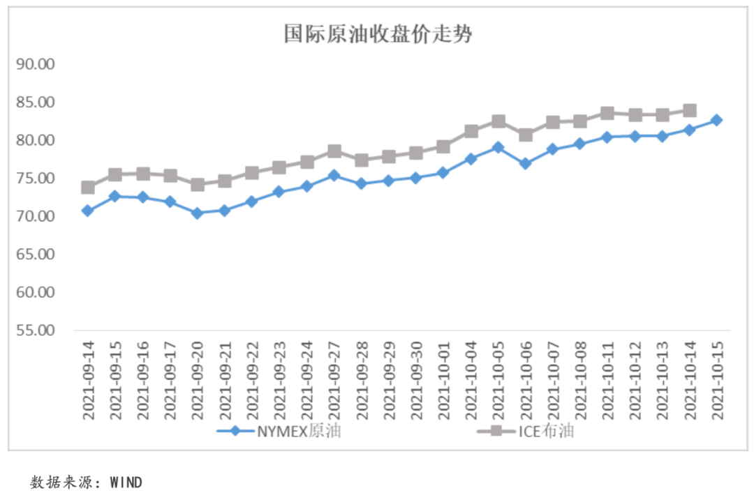 本周,國際原油市場供需失衡仍在持續(xù),國際原油價(jià)格延續(xù)上漲趨勢。從需求端看,全球經(jīng)濟(jì)復(fù)蘇導(dǎo)致工業(yè)需求強(qiáng)勁,同時(shí)由于近期飆升的煤炭和天然氣價(jià)格推升電力價(jià)格,導(dǎo)致工業(yè)生產(chǎn)由清潔能源向化石能源轉(zhuǎn)移,疊加各國放開旅行限制、北半球冬季來臨因素影響,原油需求大幅上漲。截至本周五收盤,NYMEX原油價(jià)格收于82.66美元/桶,周內(nèi)累計(jì)收漲3.86%,突破80美元/桶關(guān)口;ICE布油價(jià)格收于84.92美元/桶,周內(nèi)累計(jì)收漲2.75%,周內(nèi)一度突破85美元/桶關(guān)口。