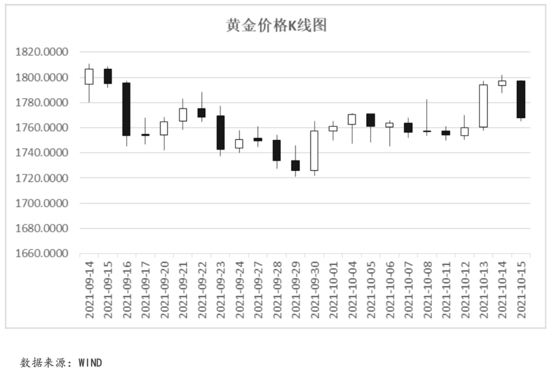 本周,上半周受美債收益率下行推動(dòng)黃金價(jià)格上漲,周五公布的9月美國零售數(shù)據(jù)推升美債收益率,黃金價(jià)格承壓下降,但未能扭轉(zhuǎn)此前的漲勢。截至本周五,COMEX黃金價(jià)格收于1,768.10美元/盎司,周內(nèi)累計(jì)收漲0.61%,扭轉(zhuǎn)了連續(xù)四周的下跌趨勢。