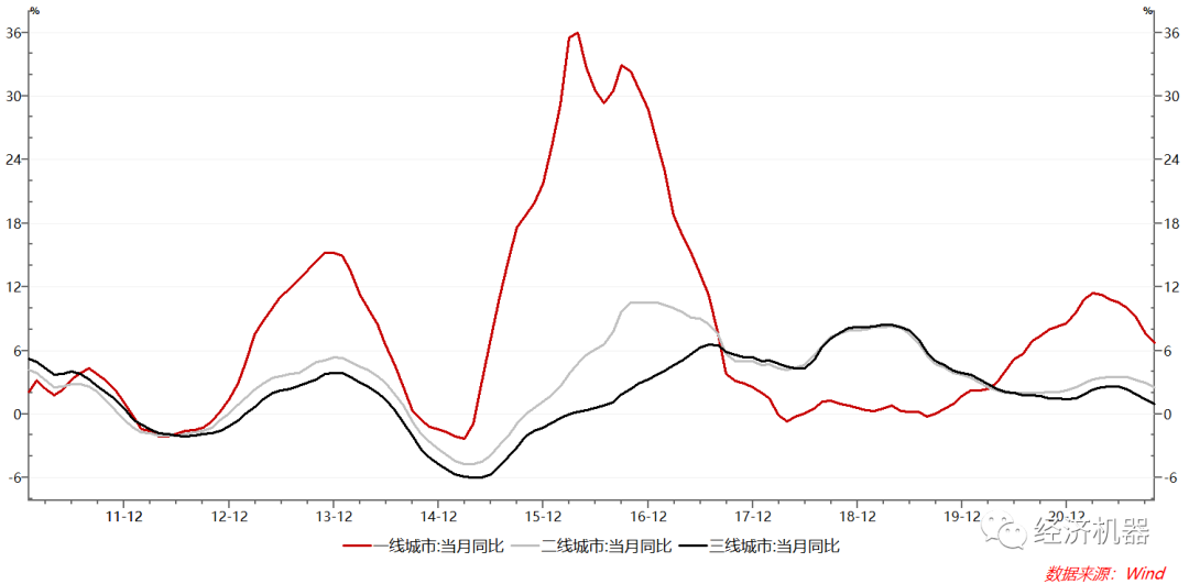 4)房地產市場惡化態勢繼續。價格方面,70大中城市二手房價漲幅繼續回落。一線、二線和三線城市同比分別上漲6.7%、2.5%和1.0%,漲幅較上月分別回落1pct、0.5pct和0.4pct,下滑趨勢明顯(圖6)。