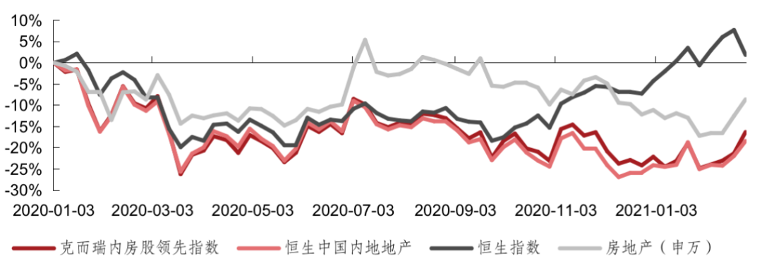 近一個(gè)月地產(chǎn)股的波動(dòng)性尤為明顯。尤其是“兩集中”供地政策傳出后的2月25日,地產(chǎn)股大漲,上證地產(chǎn)指數(shù)漲至6665點(diǎn)。隨后,地產(chǎn)股回調(diào),克而瑞內(nèi)房股領(lǐng)先指數(shù)2月走勢(shì)上漲10.6%,表現(xiàn)回暖,但仍不及大盤(pán),克而瑞內(nèi)房股領(lǐng)先指數(shù)成分股周成交額占樣本比回落至81.7%。恒生中國(guó)內(nèi)地地產(chǎn)指數(shù)上漲7.9%,恒生指數(shù)上漲0.3%,房地產(chǎn)(申萬(wàn))板塊上漲9.7%。