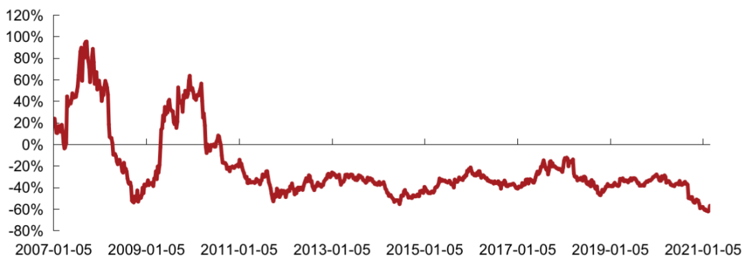 2021年2月克而瑞內(nèi)房股領(lǐng)先指數(shù)估值平穩(wěn),大盤(pán)走勢(shì)上行,指數(shù)相對(duì)恒指PE繼續(xù)走低。2021年2月相對(duì)恒指成分股的PE周均值為-60.4%,低于上月相對(duì)PE周均值-60.0%,低于2020年全年相對(duì)PE周均值-40.2%。