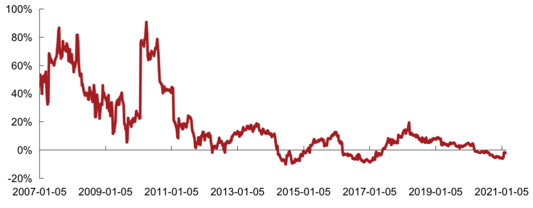 克而瑞內(nèi)房股領(lǐng)先指數(shù)成分股相對(duì)香港地產(chǎn)股大樣本整體PE 2021年2 月進(jìn)一步回升。2月該相對(duì)PE周均值為-1.8%,高于上周均值-4.7%,低于2020年周均值-1.5%。香港地產(chǎn)股大樣本2月整體PE周均值為7.27,低于上月周均值7.32,低于2020年至今周均值7.42。