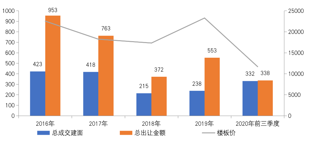 圖:2016-2020年前三季度深圳經(jīng)營性土地總成交建面、成交金額和樓板價(萬平方米、億元、元/平方米)