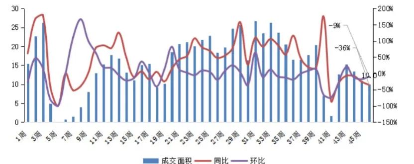 圖:2020年第1周-第46周深圳二手住宅成交面積(萬平方米)