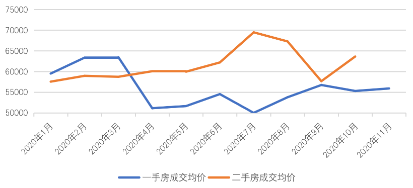 一手房方面,均價受市場及政策更為明顯,2020年6月在疫后恢復階段曾出現(xiàn)過一個小高峰,隨后受政策影響跌入全年最低谷,為50011元/平方米,隨后再緩慢恢復。