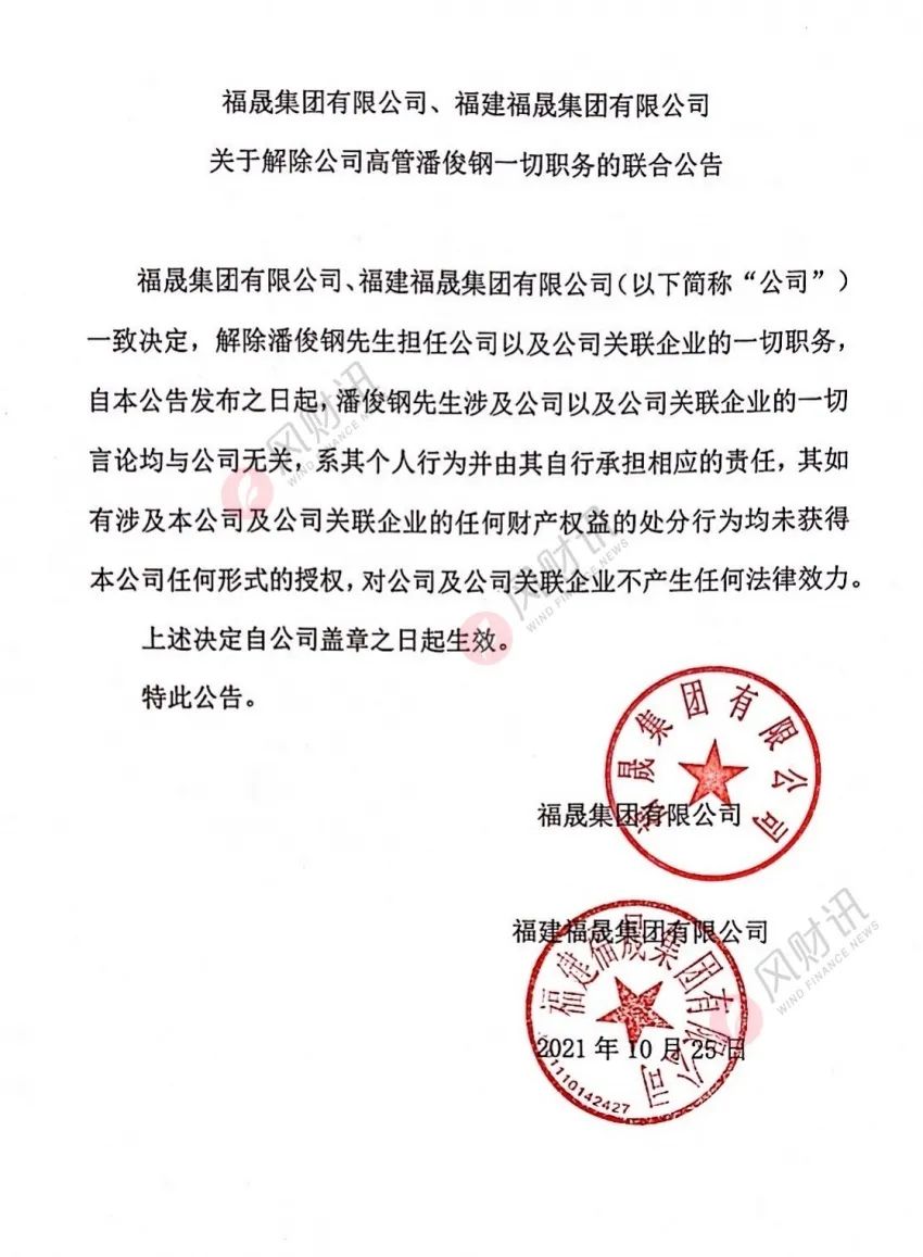 福晟集團(tuán)有限公司、福建福晟集團(tuán)有限公司共同發(fā)布了一份名為《關(guān)于解除公司高管潘俊鋼一切職務(wù)》的聯(lián)合公告,并加蓋兩家公章。
